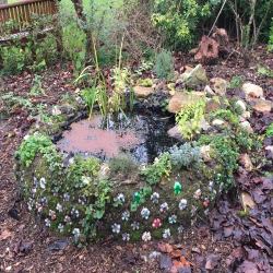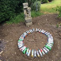 This wildlife pond was built with ecobricks during lockdown. It has an eco-friendly pond liner and is planted with nature friendly plants from the local area. The aim was for the plants to hold the soil (chalk based with dried grass to bind) in place. Four years on it is doing well though the sides have needed to be reinforced.